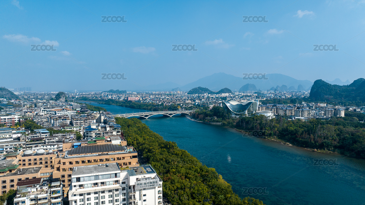中国广西桂林漓江歌剧院和解放桥航拍风光