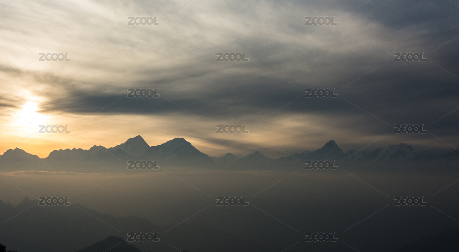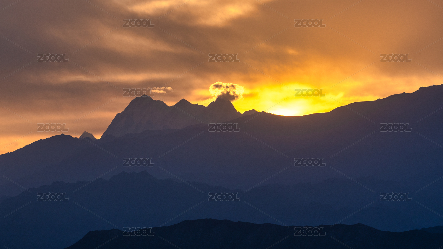 在牛背山的半山腰看夕阳西下,阳光映红了云层,雪山连绵起伏