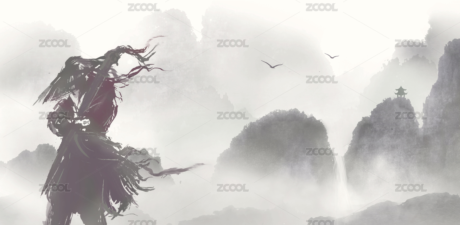 剑客山上练剑飞鹰翱翔天际的水墨插画