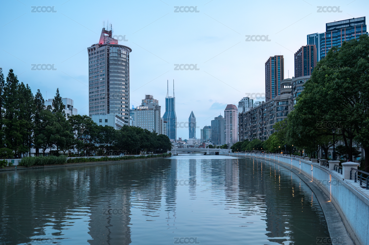黄昏中的中国上海黄浦苏州河畔自然风光建筑景观