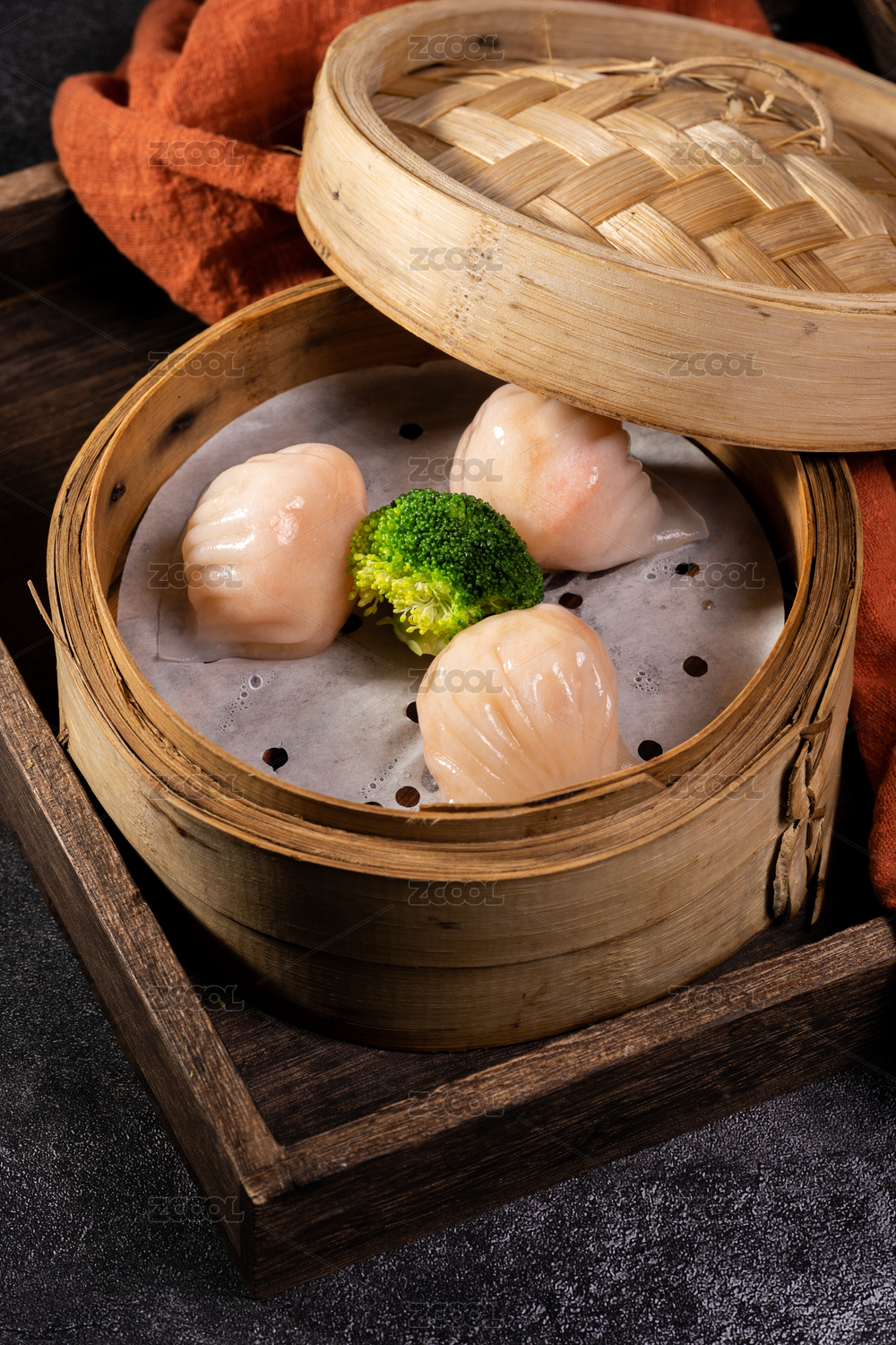 白色背景下精美竹笼屉装的港式茶餐蒸虾饺