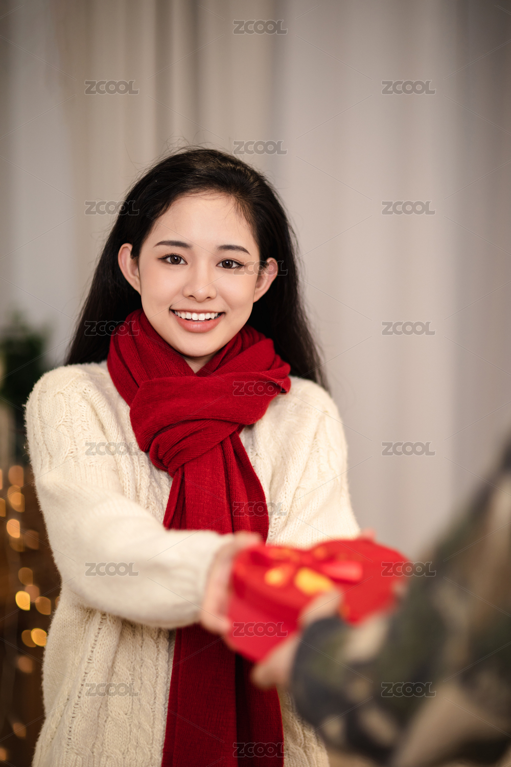 圣诞节年轻女孩坐在沙发上笑容灿烂