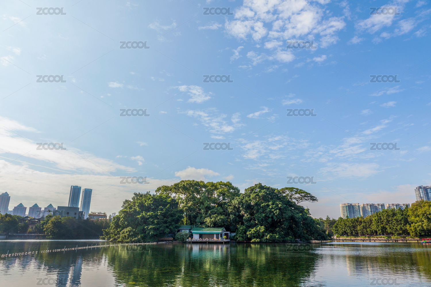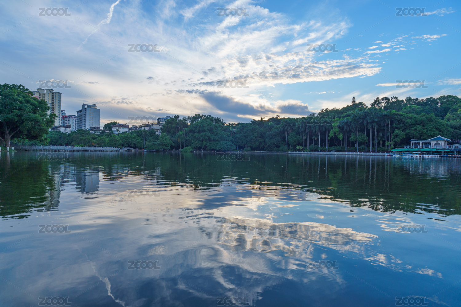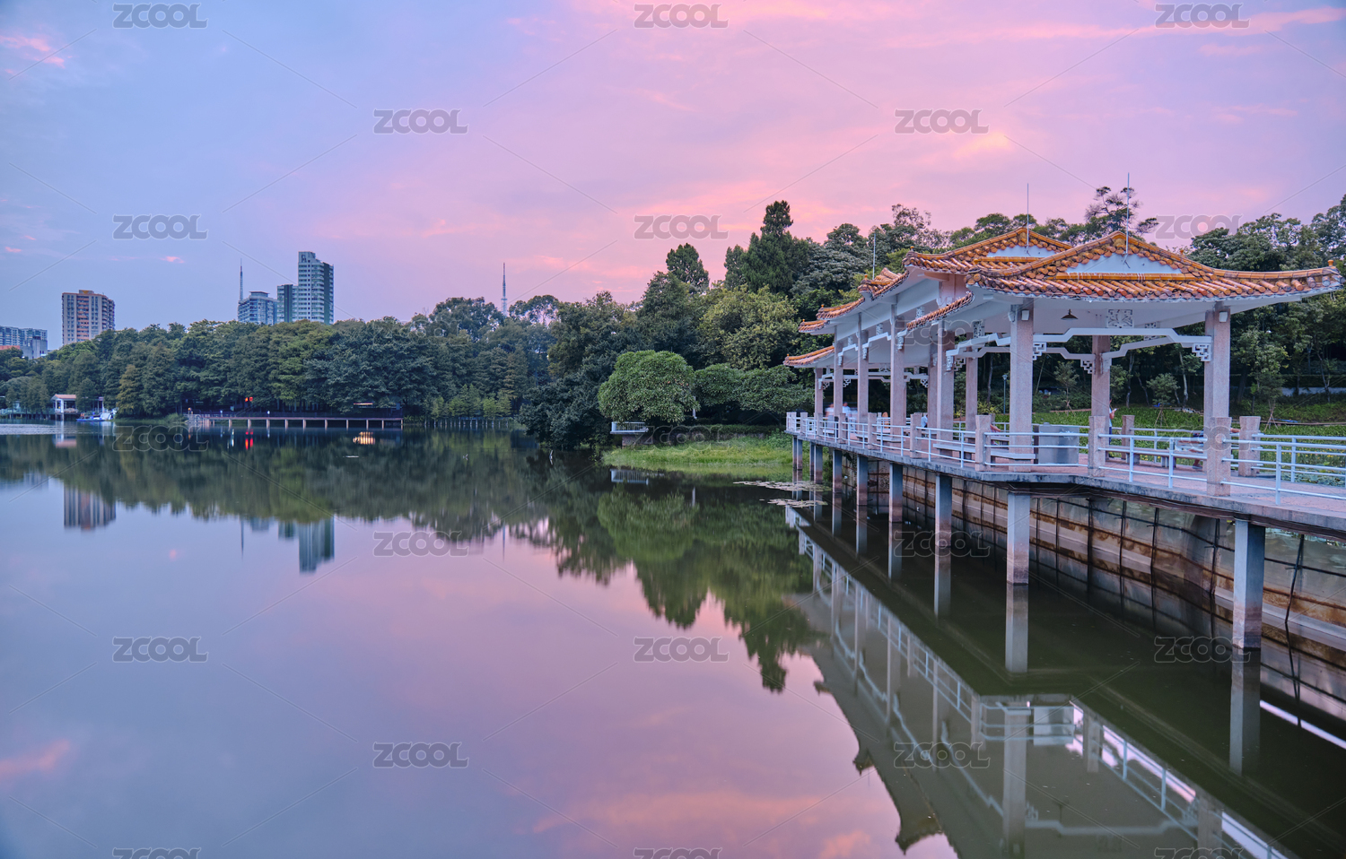 广西南宁市人民公园湖泊树林与夕阳晚霞