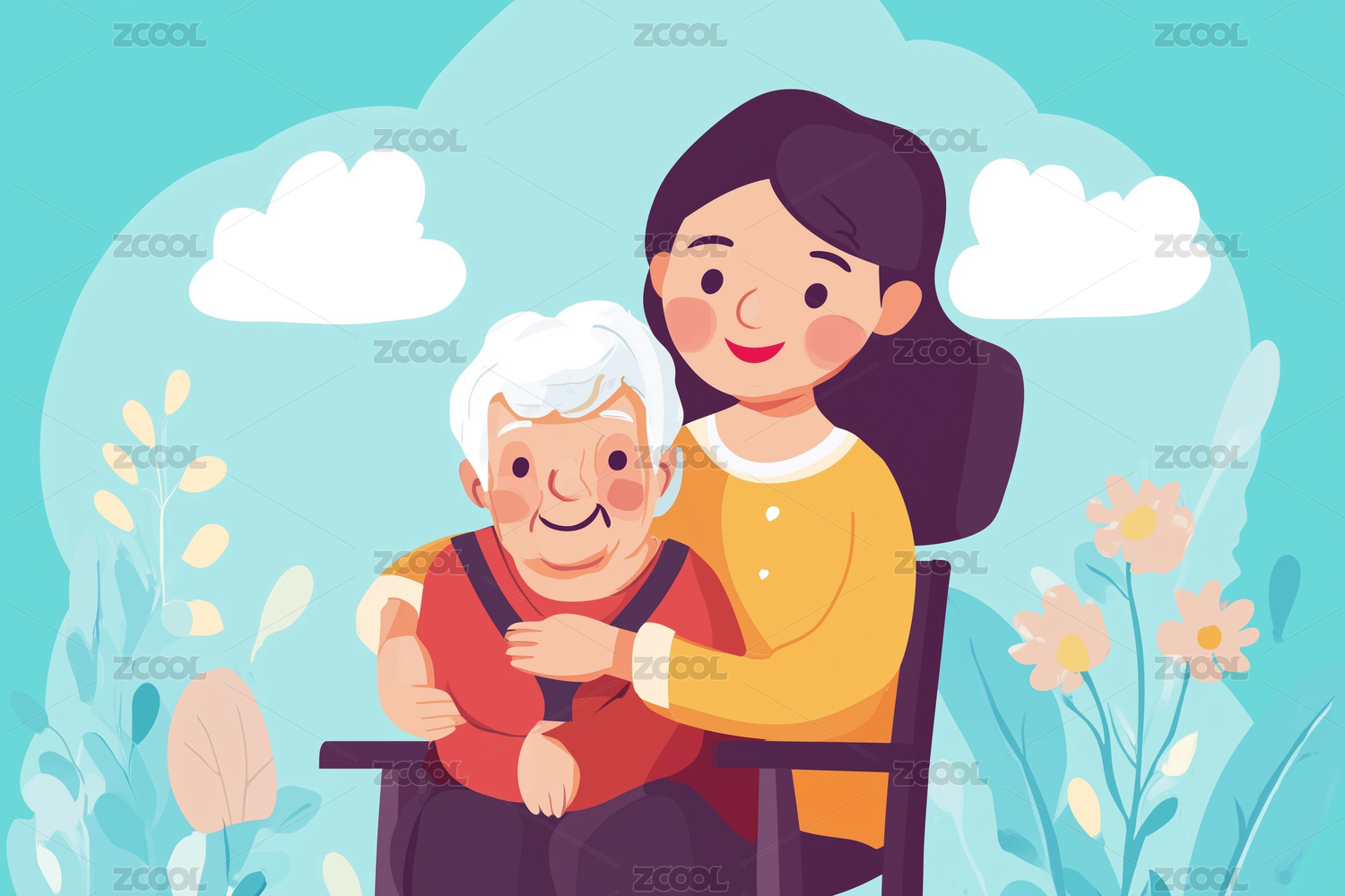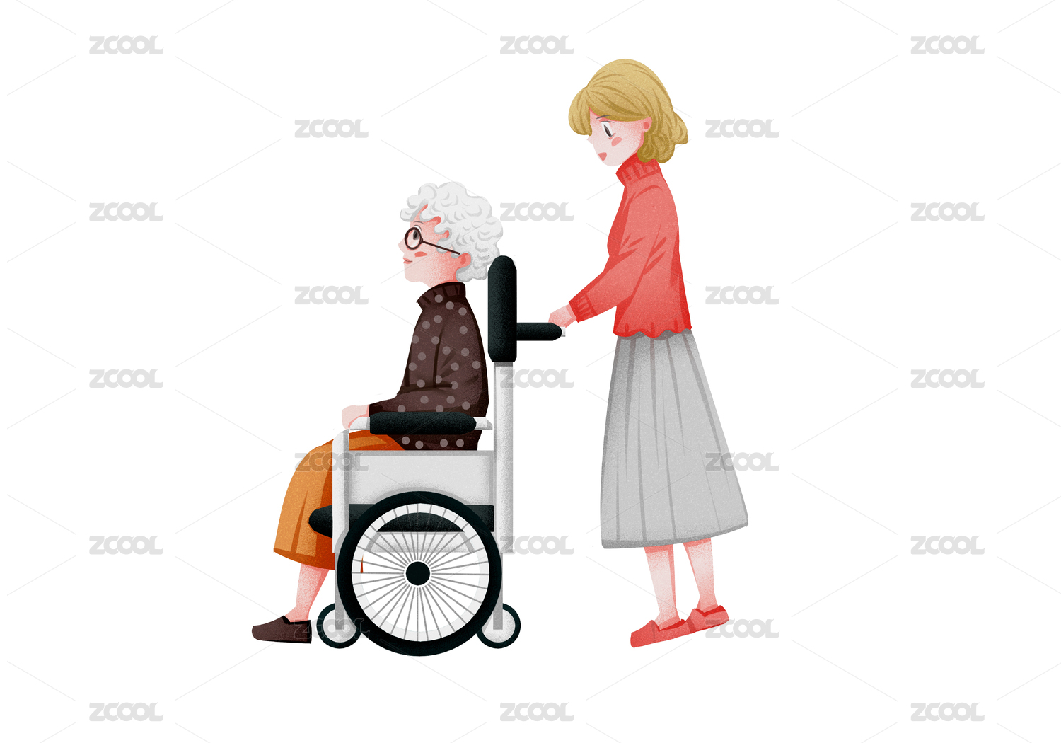 孙女推着老奶奶散步 可爱风格重阳节关爱陪伴老人插画