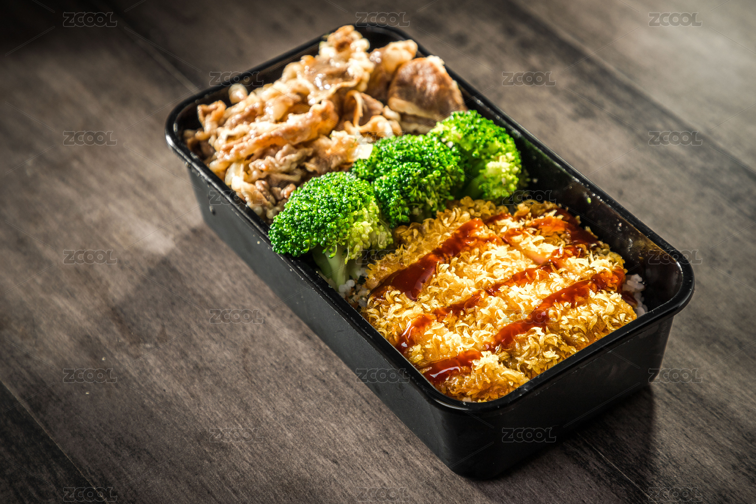 暗色木纹桌上放着一份日式洋葱肥牛与酱汁炸鸡排便当