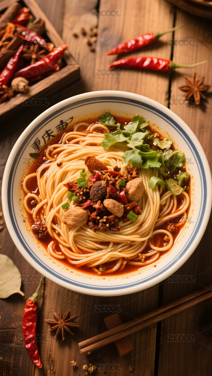 木桌上一碗香辣的红汤牛肉面的竖构图