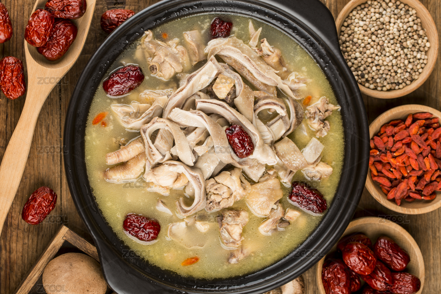 黑色砂锅里的大补红枣枸杞药膳猪肚鸡汤底