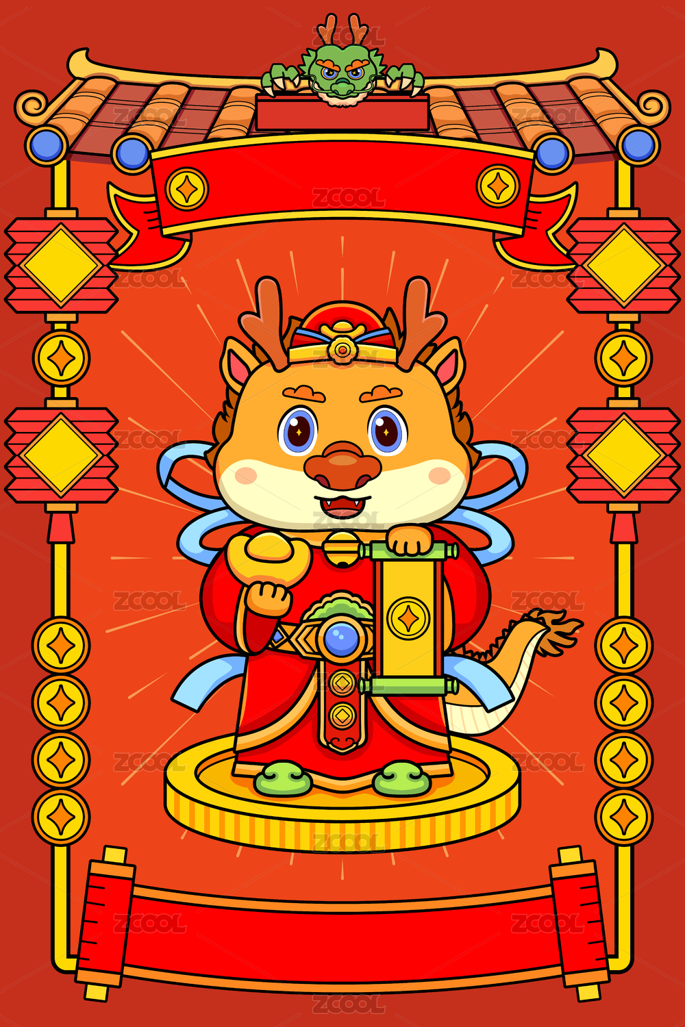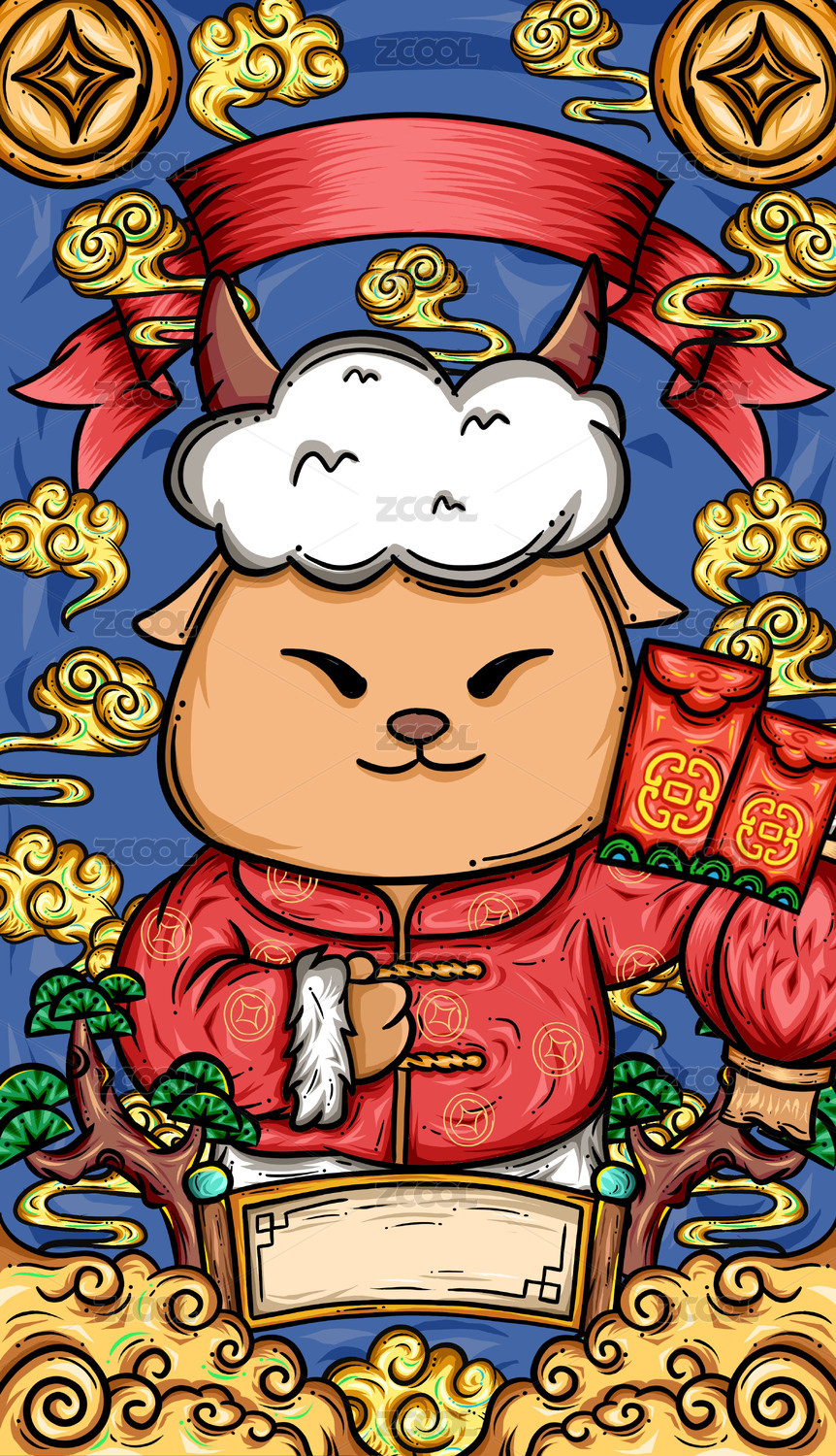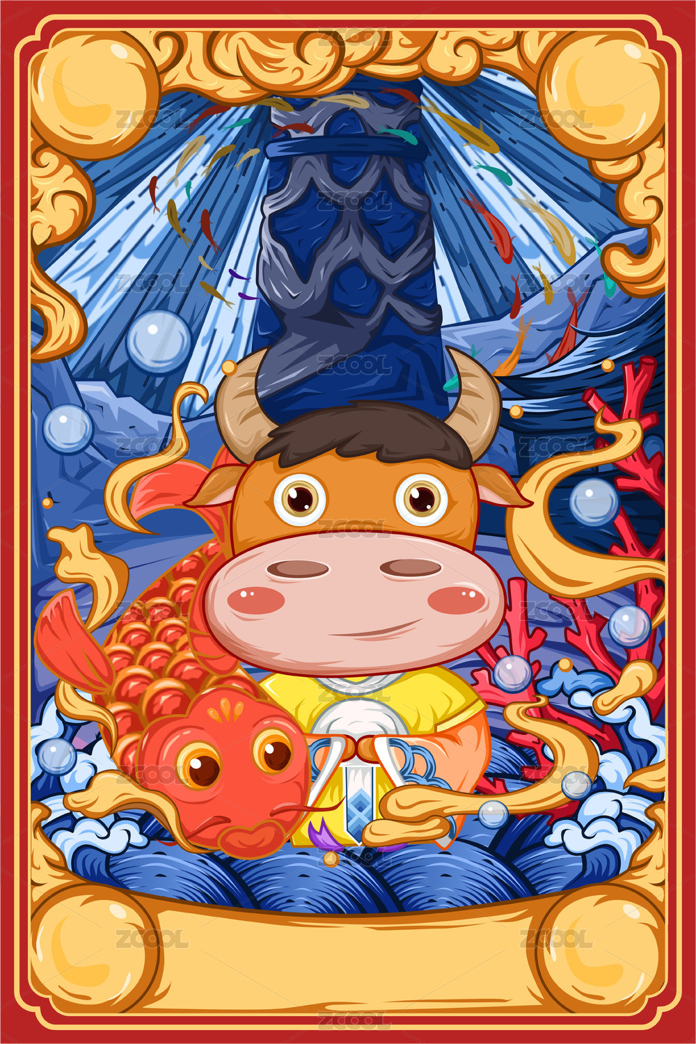 东海风光牛气冲天锦鲤珊瑚国潮风插画