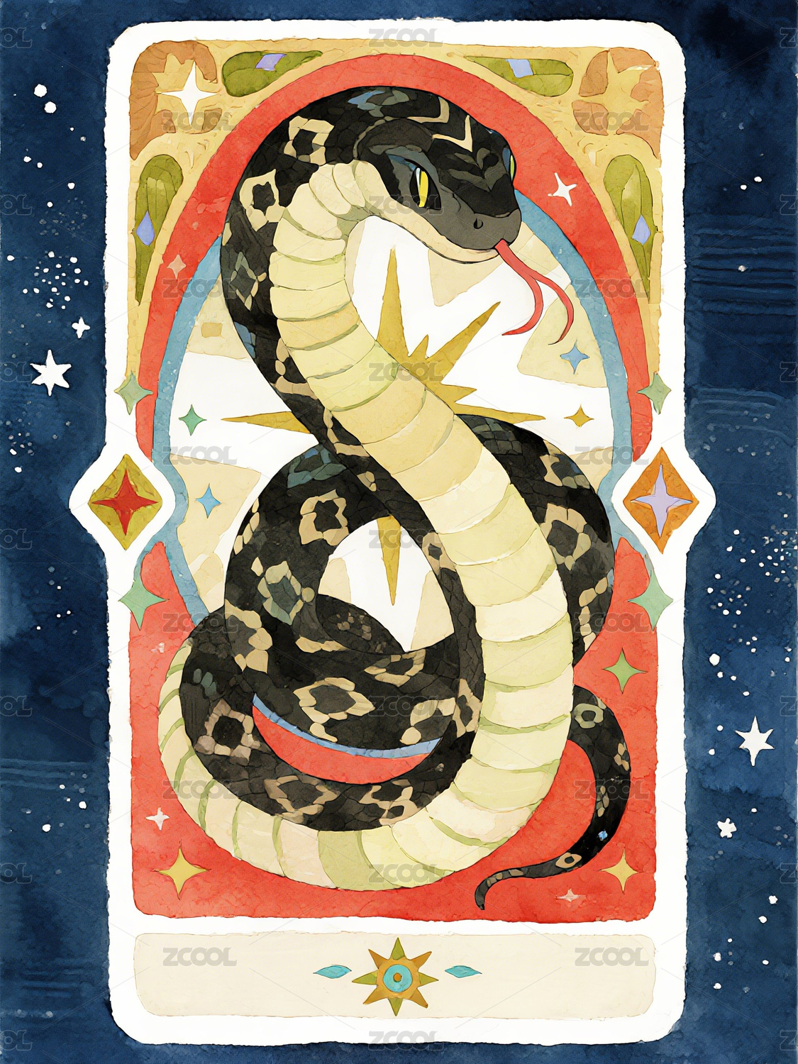 国潮风,敦煌,十二生肖,动物,红色,生肖,飞天,巳蛇,插画