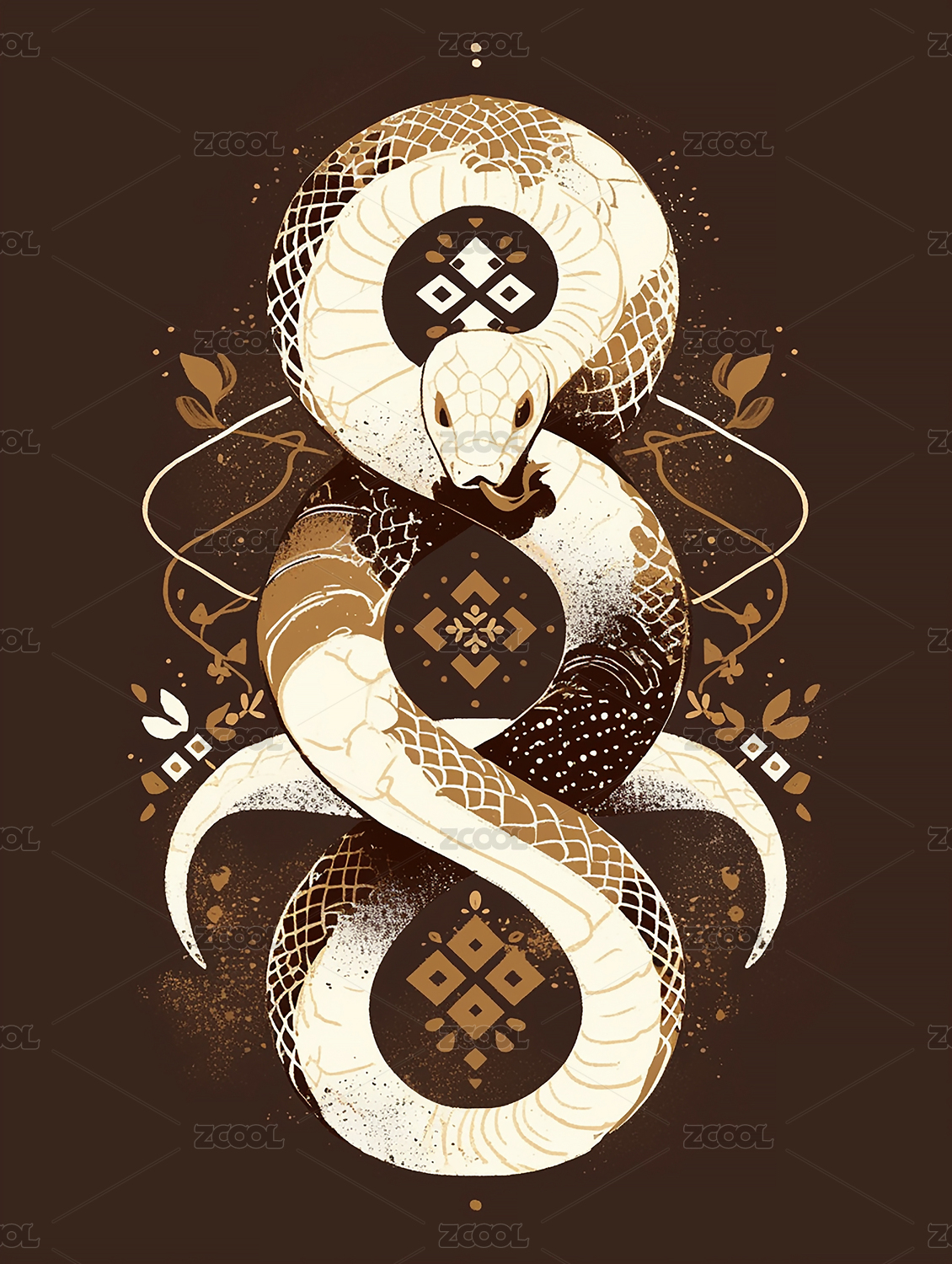 喜庆的复古风格五彩斑斓的蛇和花朵