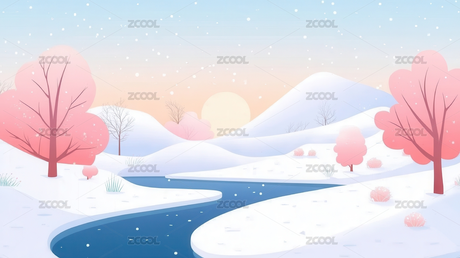 冬季,雪景,插画,风景,自然,粉色,树木,山,道路,卡通
