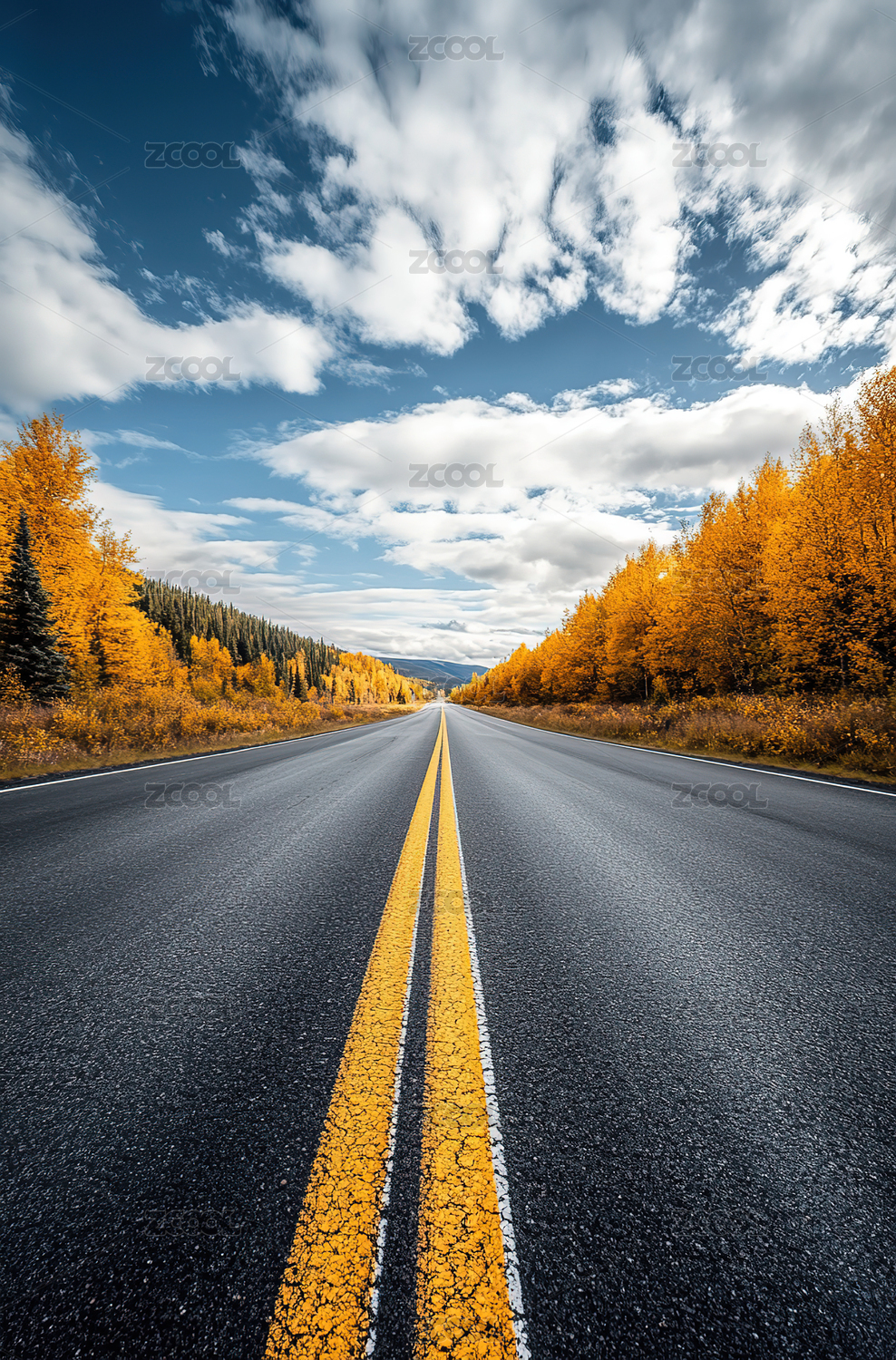 中国新疆喀纳斯秋天的道路与两边黄色的树