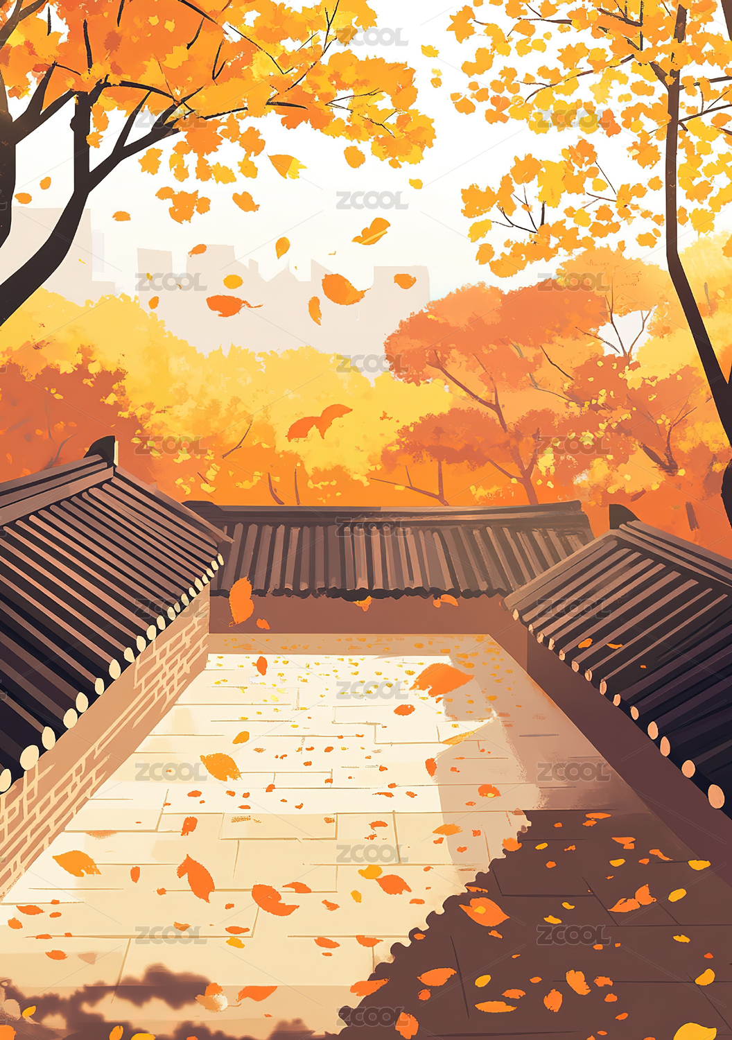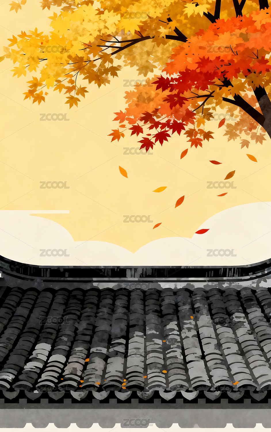 秋天中式建筑屋顶银杏树叶插画背景壁纸