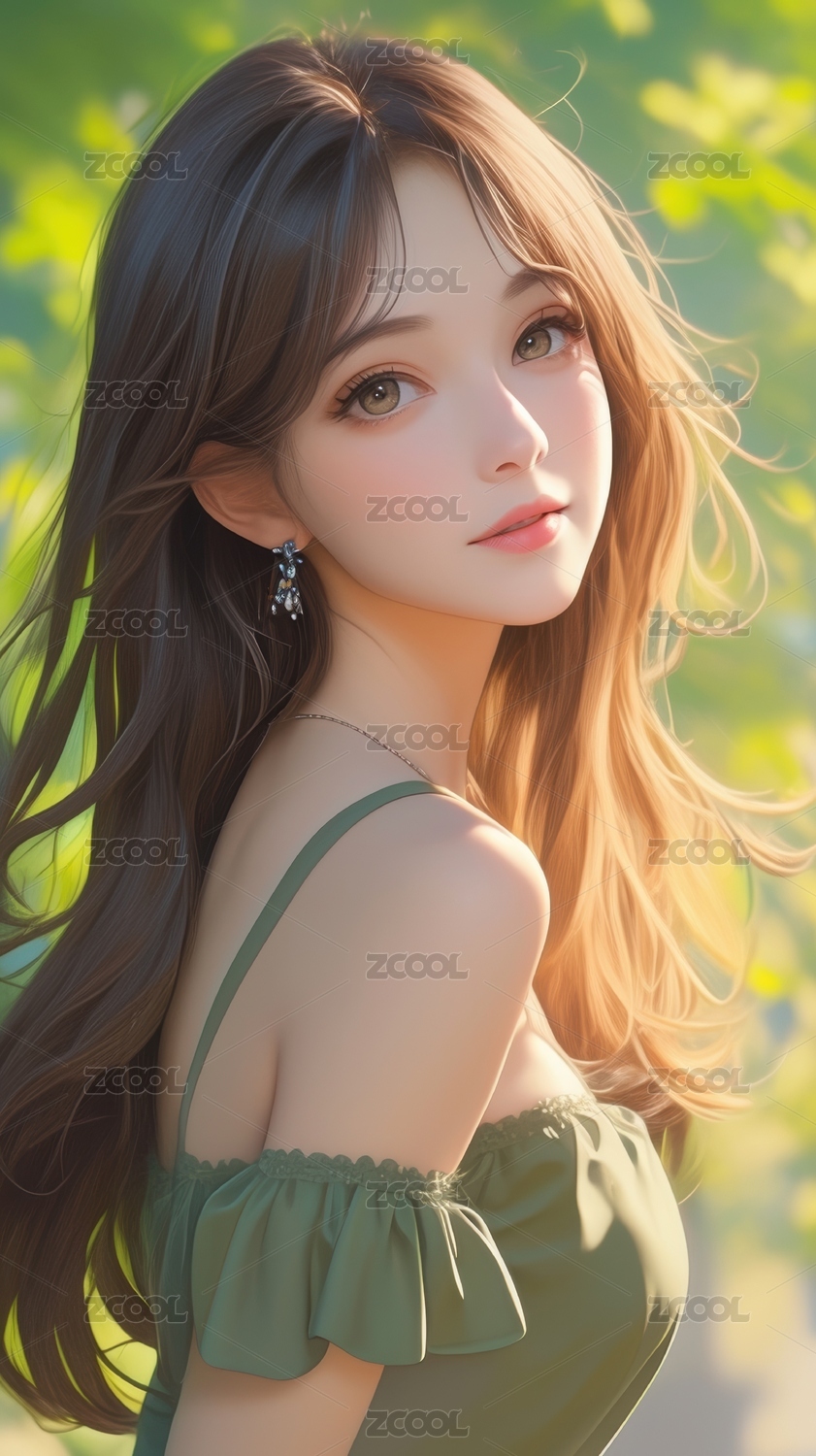 绿裙少女在自然光下的温柔瞬间