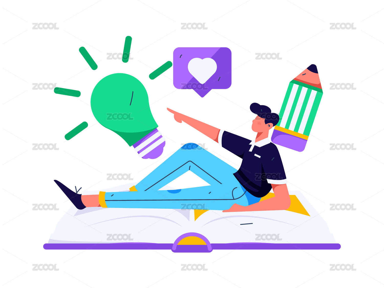 蓝色短袖男子抱着灯泡坐在书上知识书籍