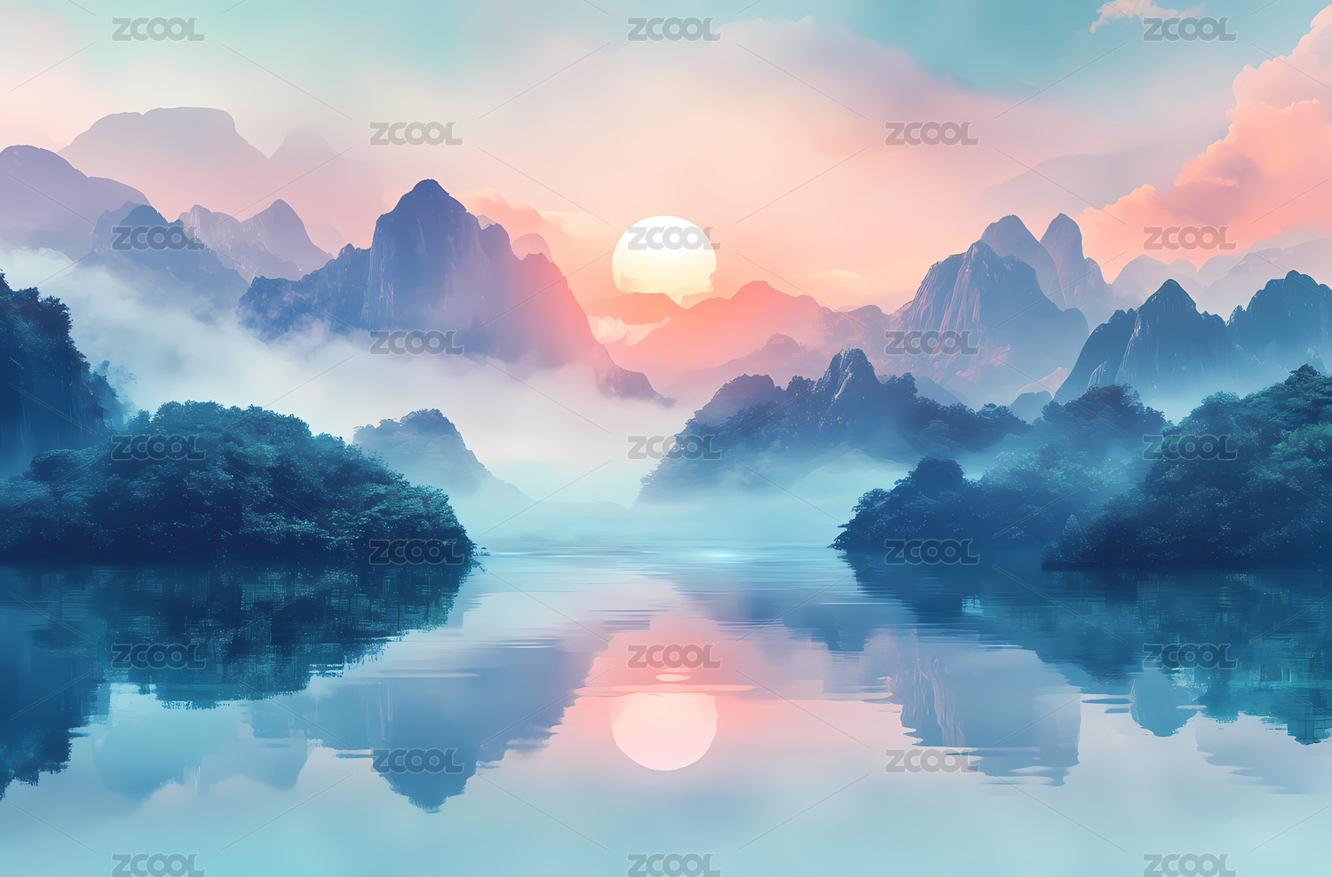 中国风,山水,山,风景,云海,阳光,插画,水墨画