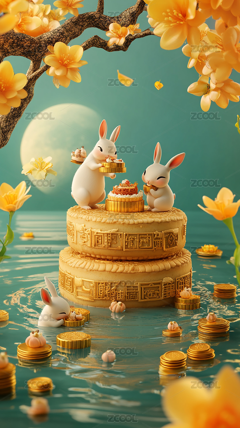 中秋节小兔子和月饼3D场景