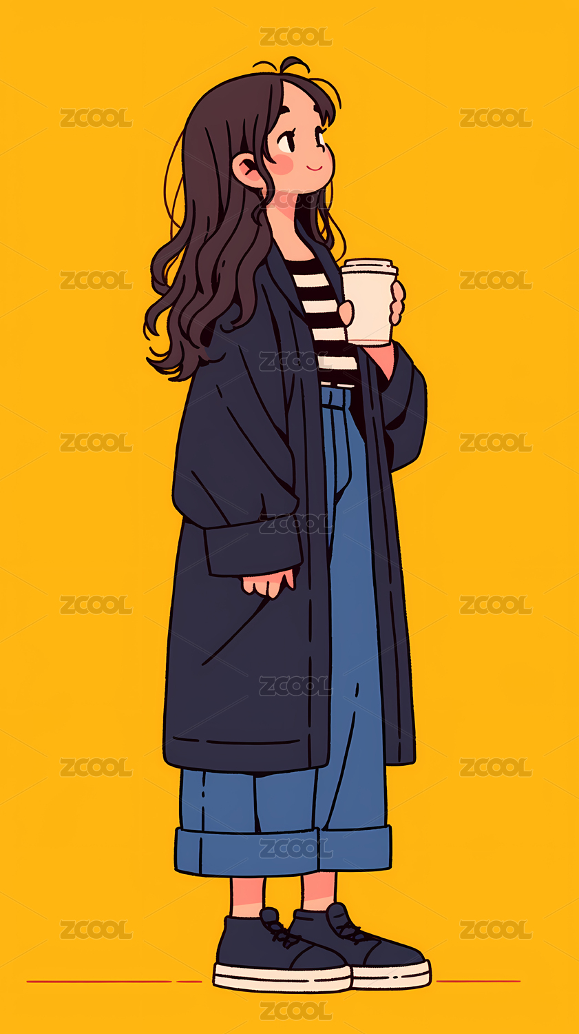 穿着蓝色长风衣的女性插画