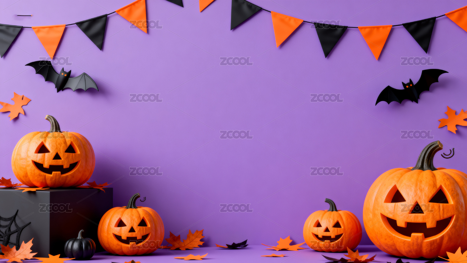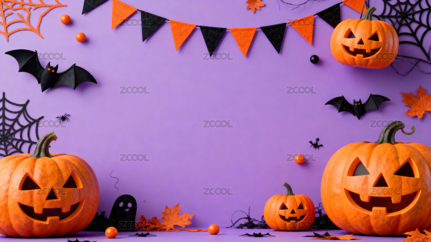 紫色背景下的万圣节南瓜装饰