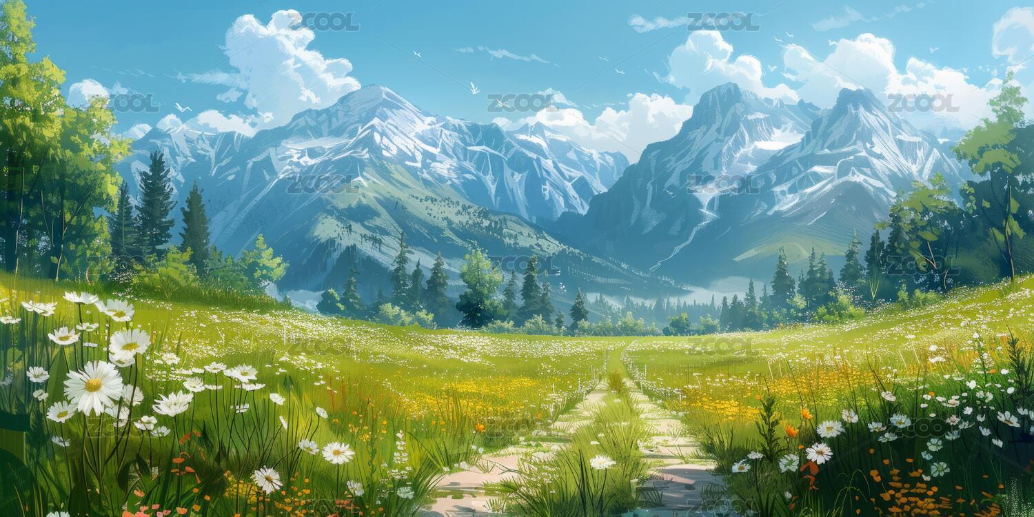奇幻山地花卉景观插画