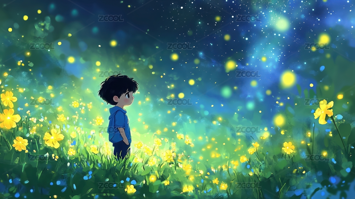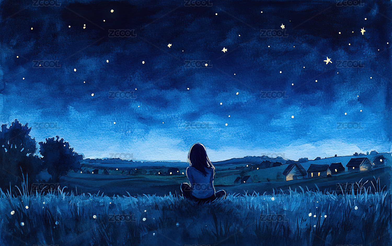 童话夜景梦幻小屋女孩望着月亮星空治愈插画
