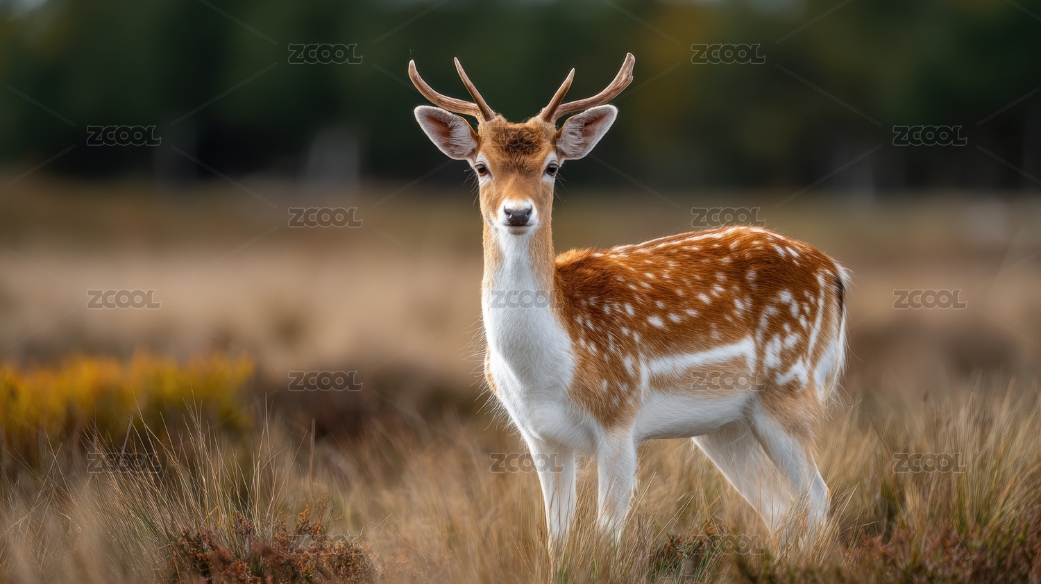 一只鹿站在草丛中背景是树木图片