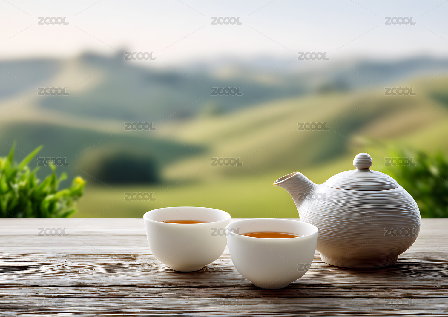 白色茶具和竹托盘的茶道场景