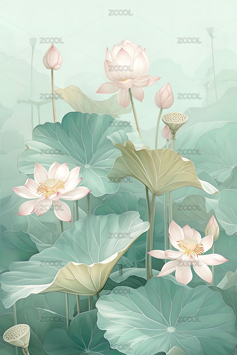 中国风夏季荷花荷塘艺术插画