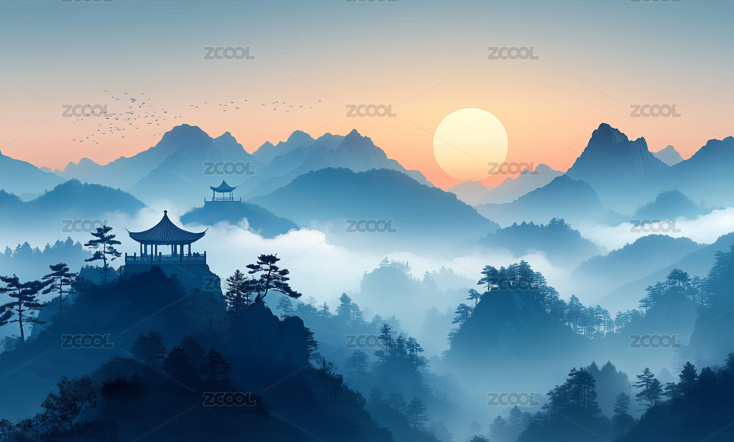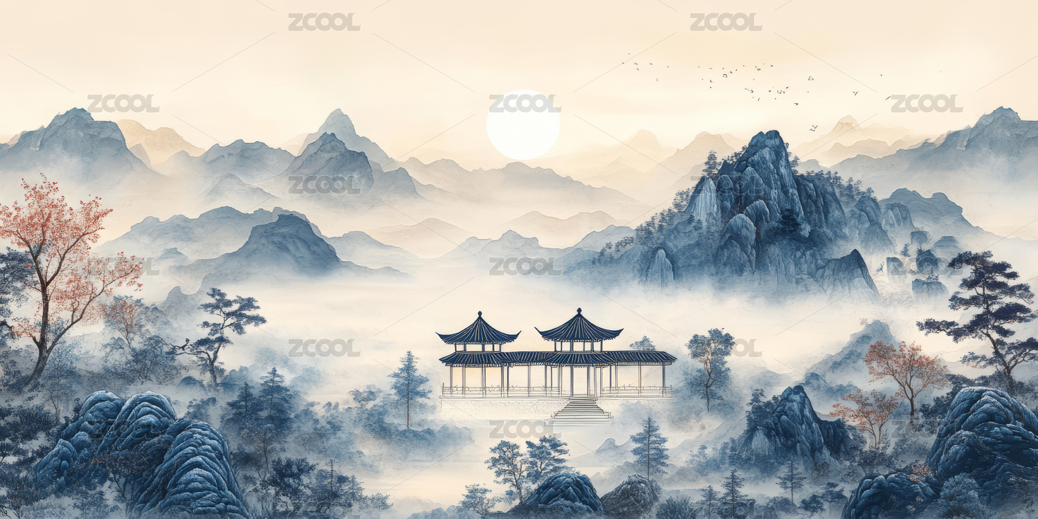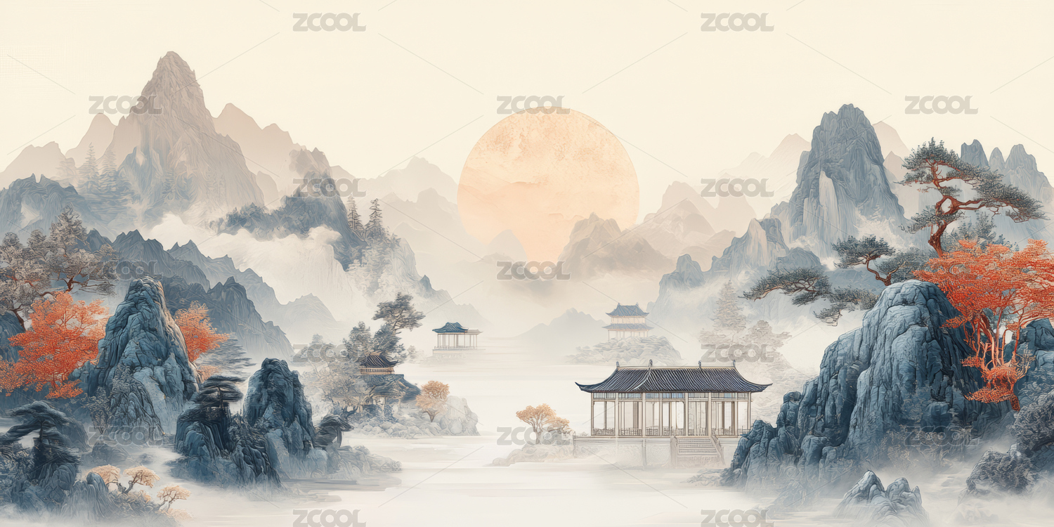 中国元素,中国文化,传统,古典,山水画,国风,极简,山岳,湖,船