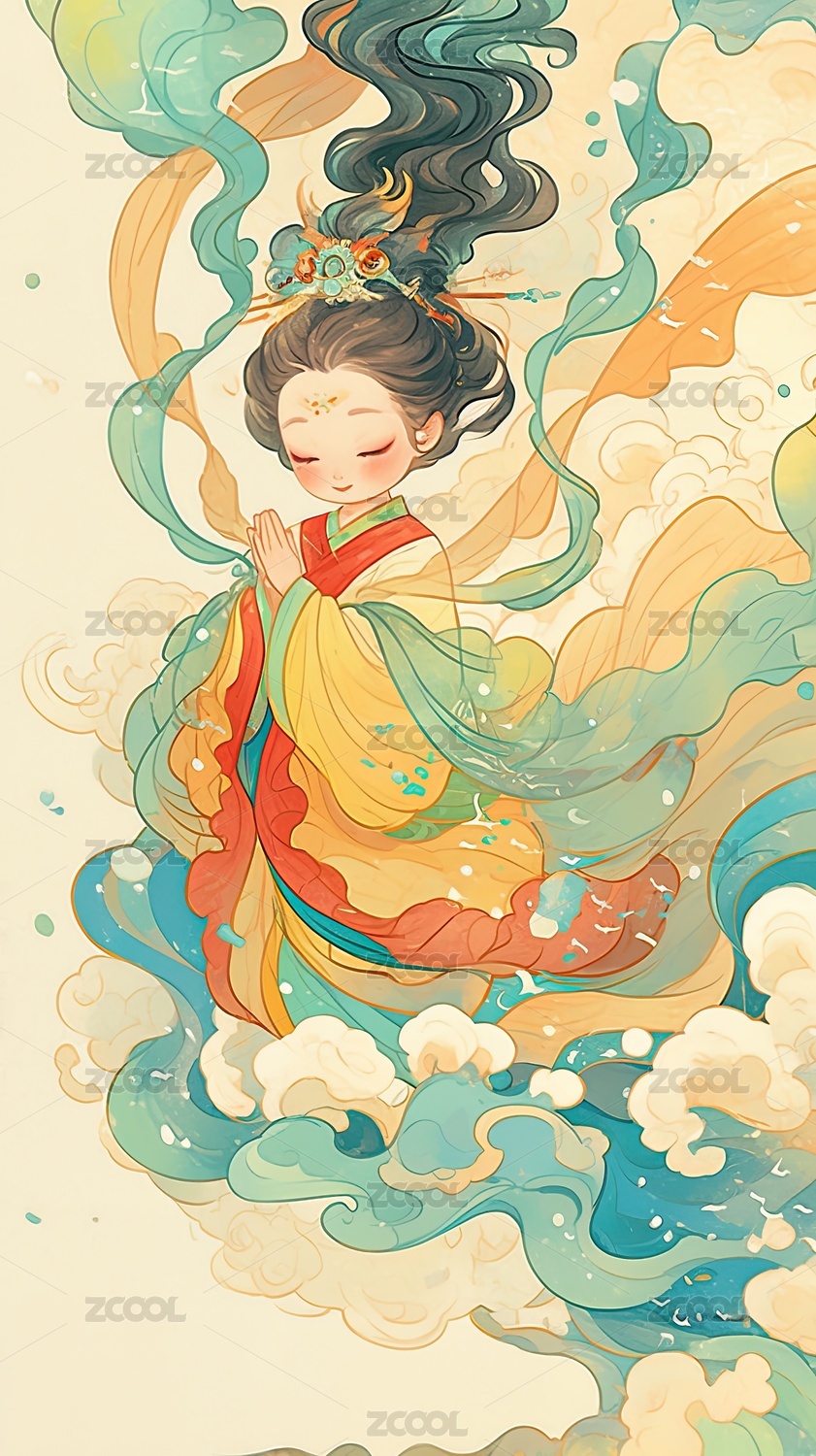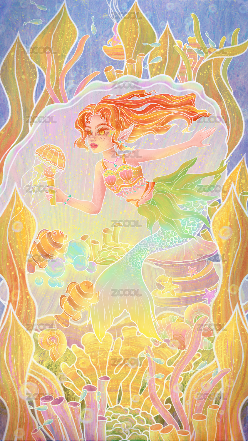 金鱼和水母围绕着闭着眼睛的人鱼少女