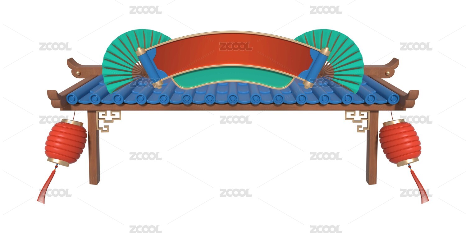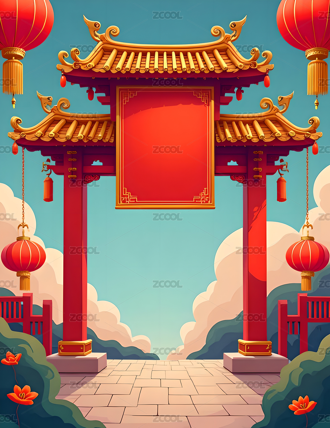 矢量国潮春节元宵节灯笼装饰牌坊美陈背景墙
