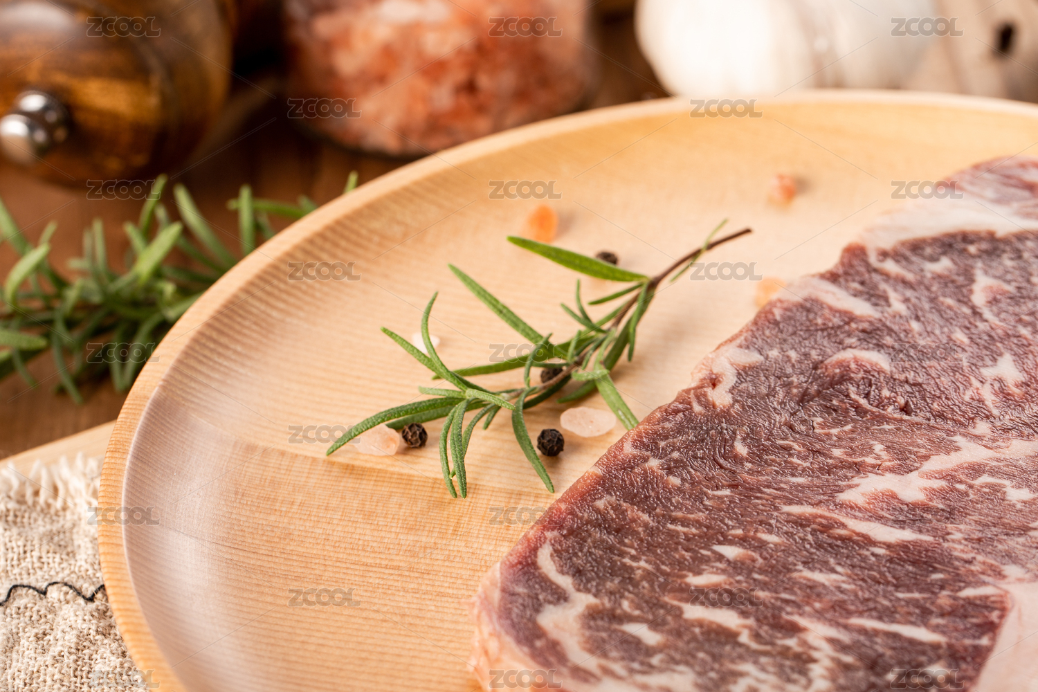 一片新鲜和牛西冷M4放在木板背景上的木盘里