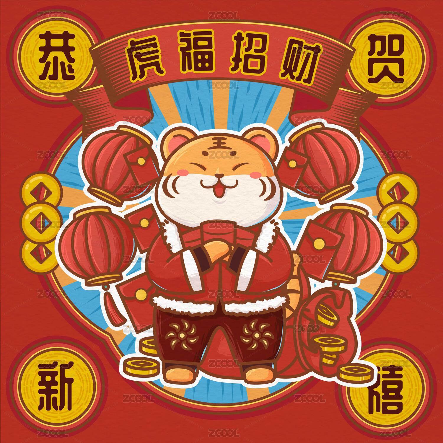 卡通老虎财神爷插画