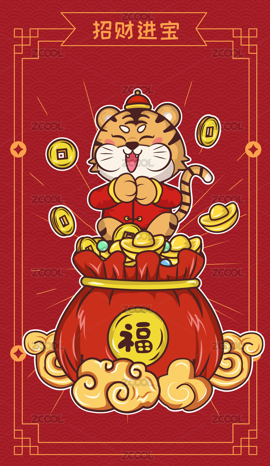 国潮虎年财神老虎手机壳壁纸插画
