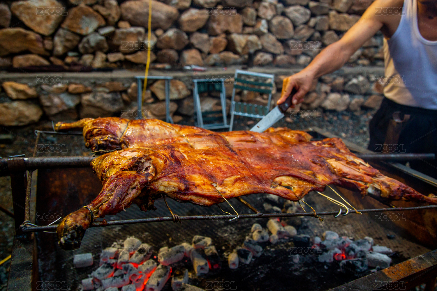 一整只在火炭上烧烤的脆皮香猪