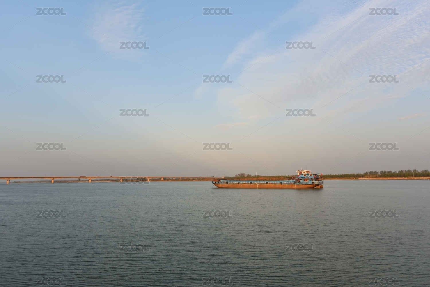 远处的桥和水面停泊的船