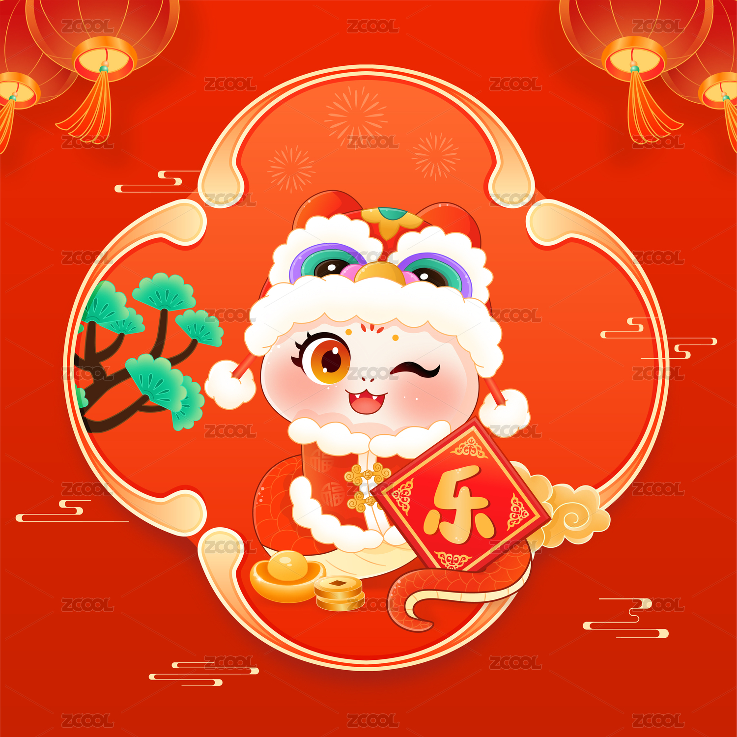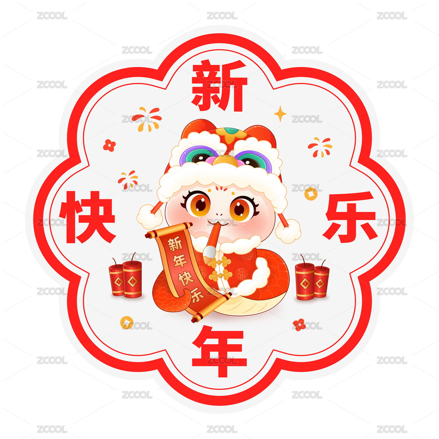国潮春节新年蛇年生肖爆竹灯笼蛇窗花