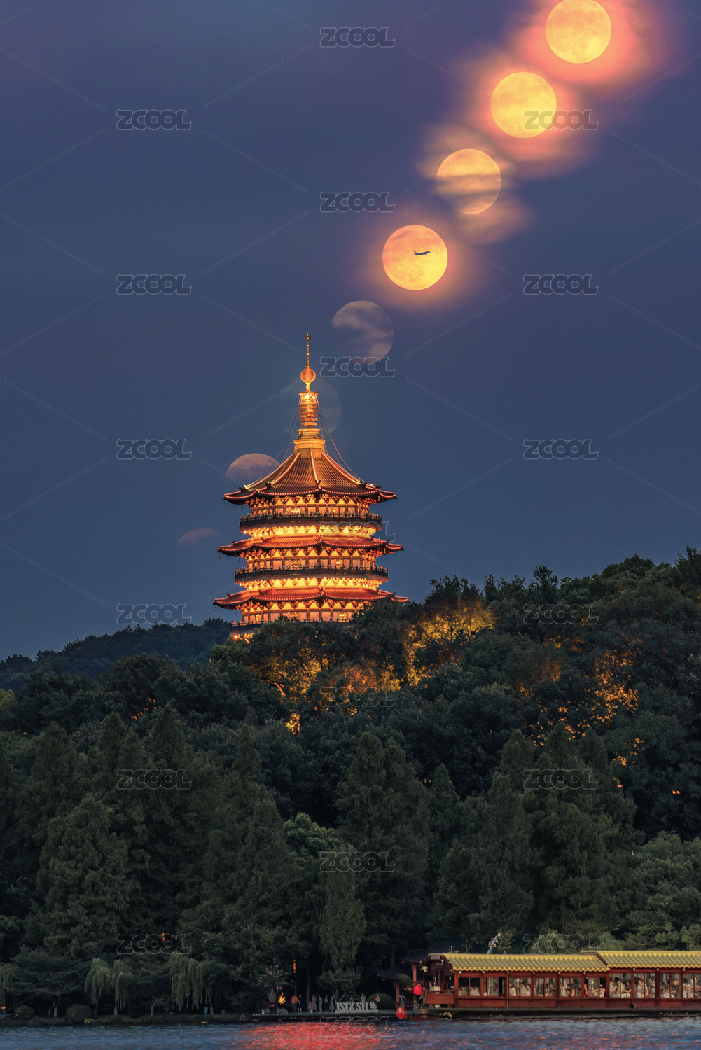 杭州西湖雷峰塔月亮满月中秋月
