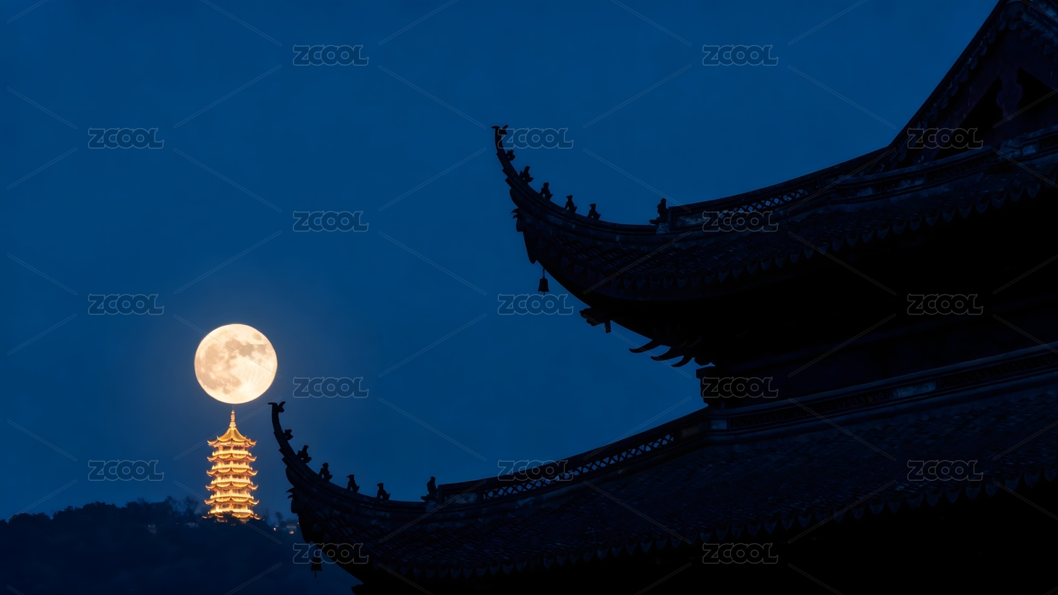 满月高悬古塔剪影夜空