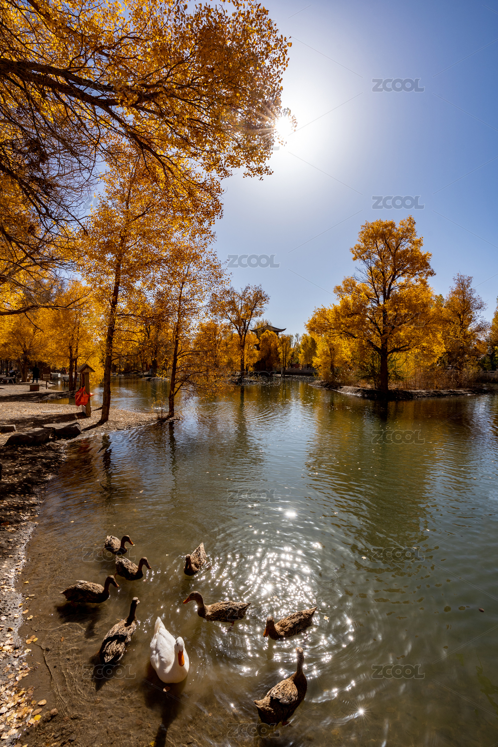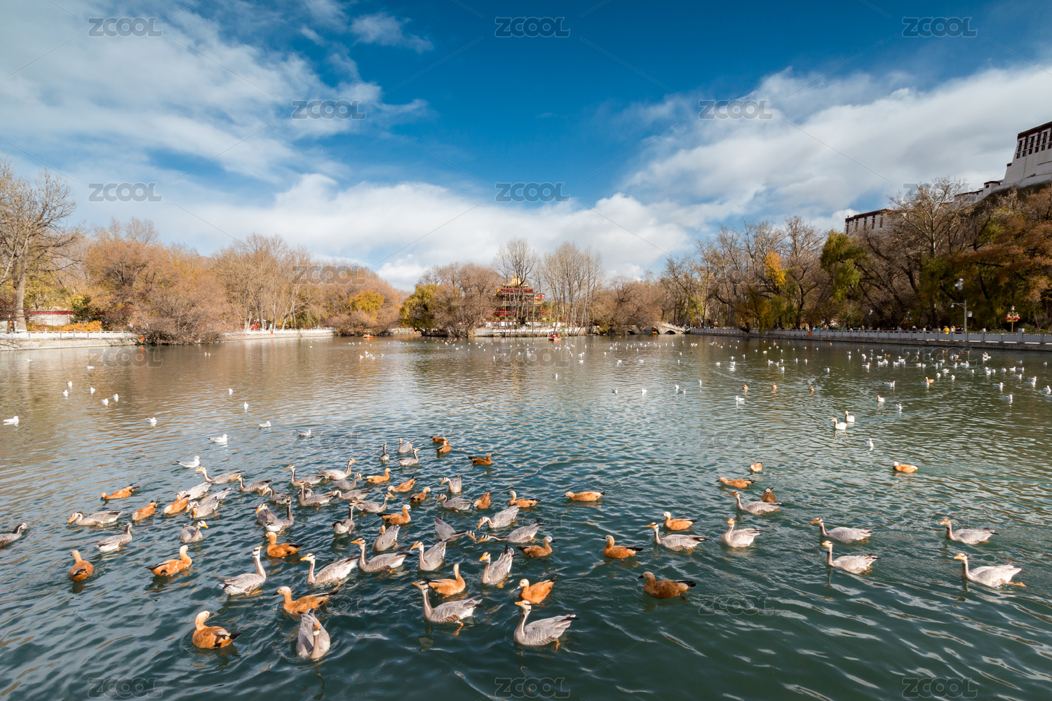 西藏,拉萨,布达拉宫,宗角禄康公园,候鸟,斑头雁,赤麻鸭,水池,秋天,树