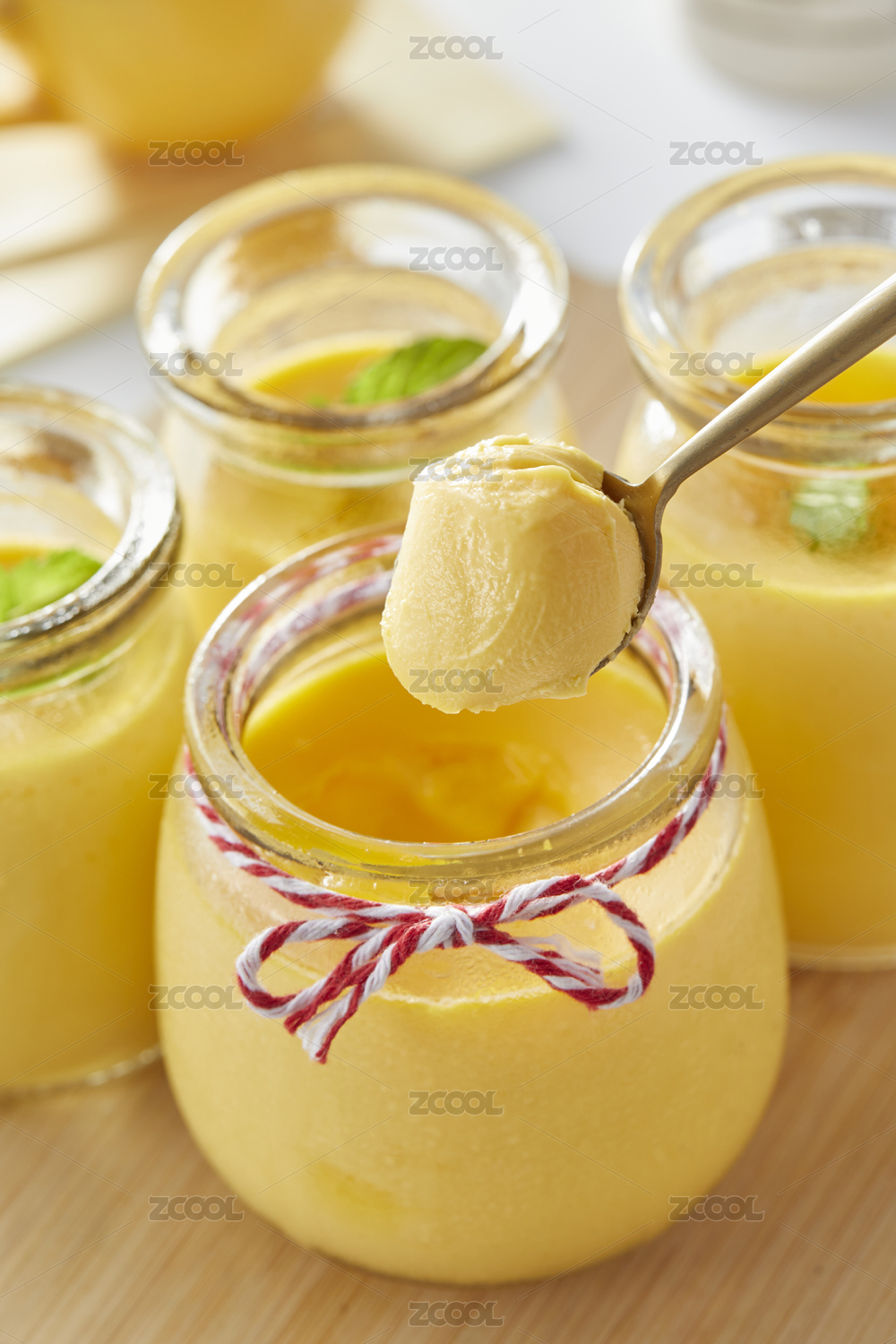 灰色背景布的木碟上摆放着一杯芒果西米露