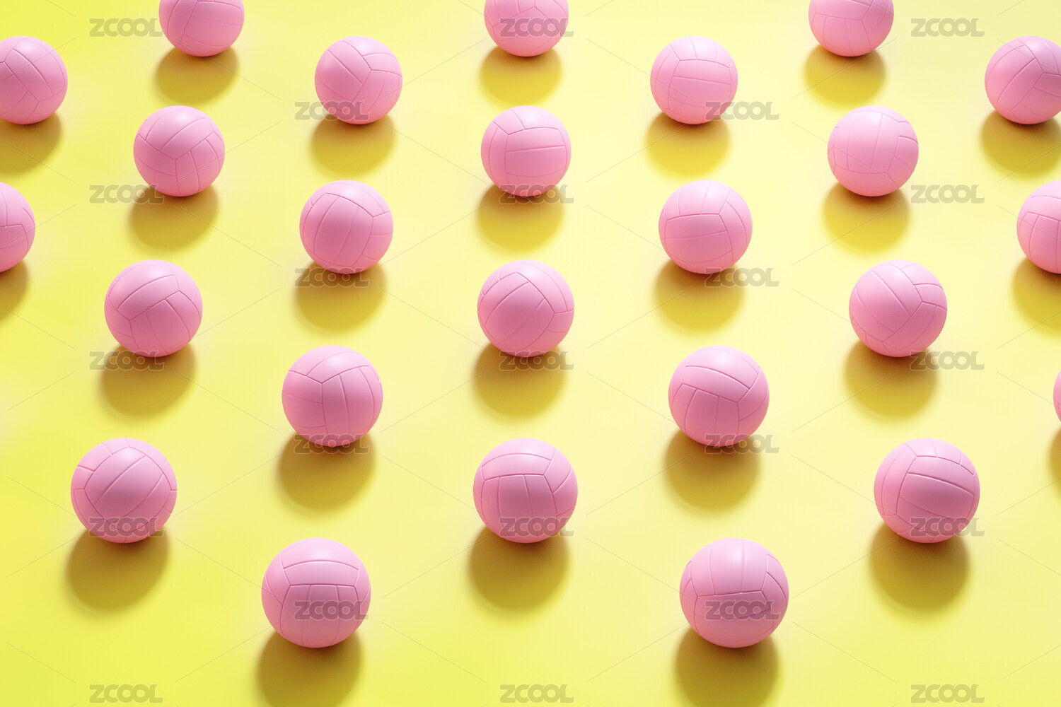 3d渲染粉色排球排列在黄色背景上。运动装备。竞技比赛。团队协作和领导力的创意设计概念背景