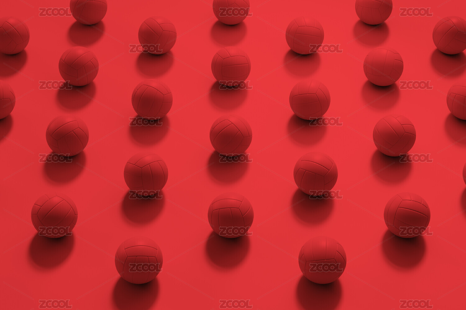 3d渲染红色排球排列在红色背景上。运动装备。竞技比赛。团队协作的创意设计概念背景