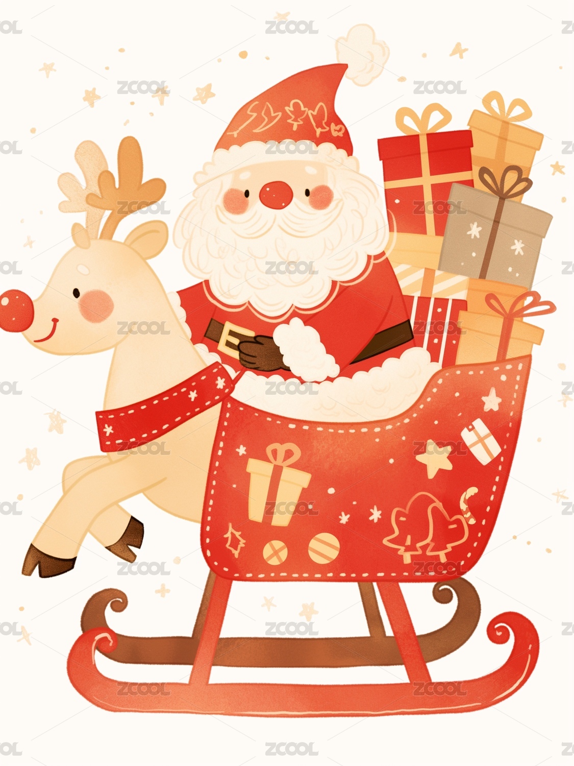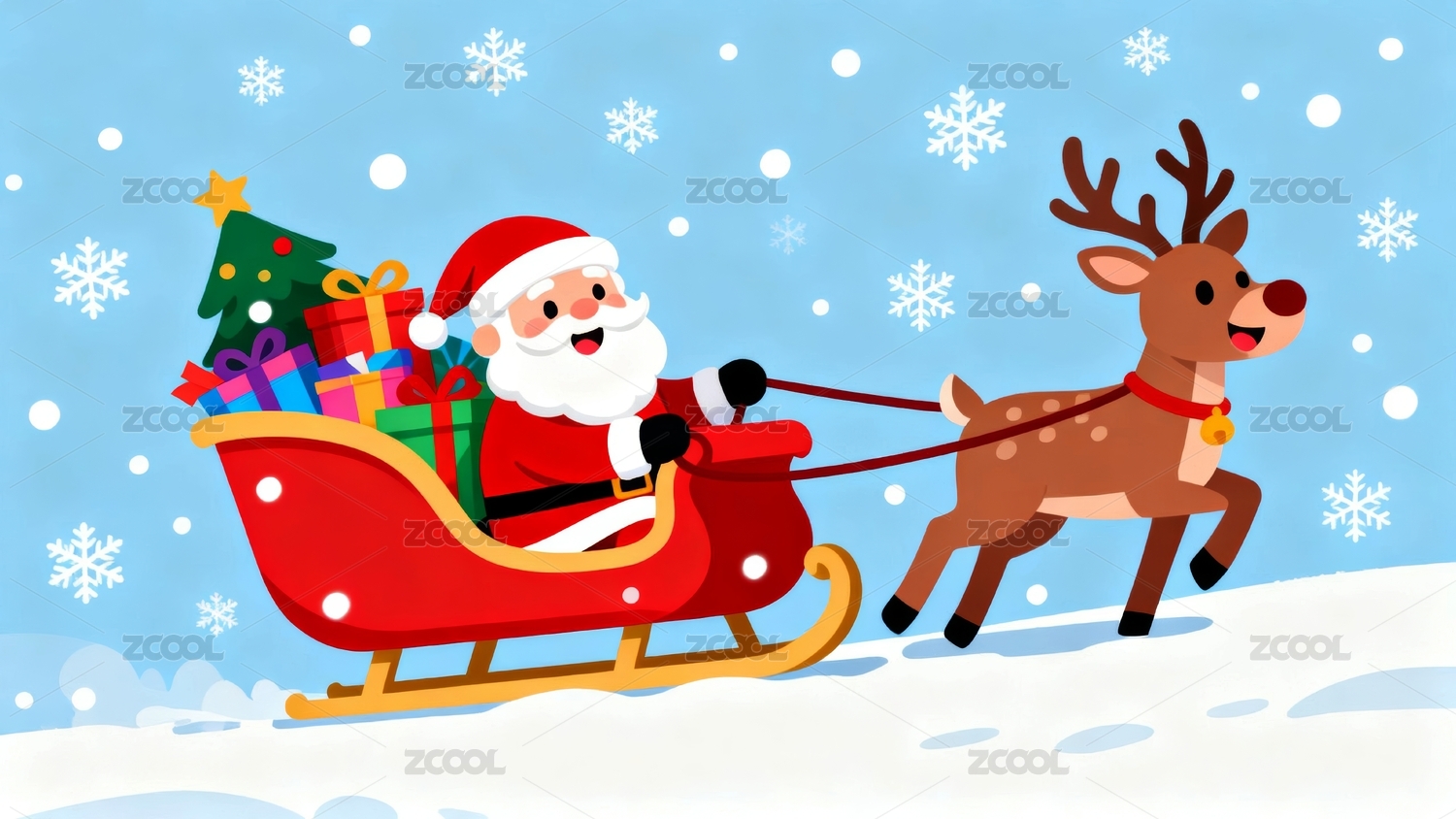 圣诞节圣诞老人坐驯鹿雪橇车送礼物节日插画