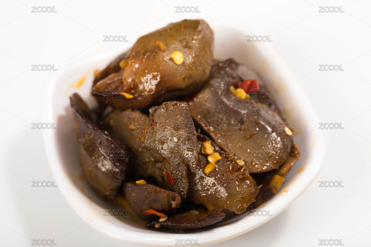 用白色四角碟装的卤菜鸭心放在白色背景上