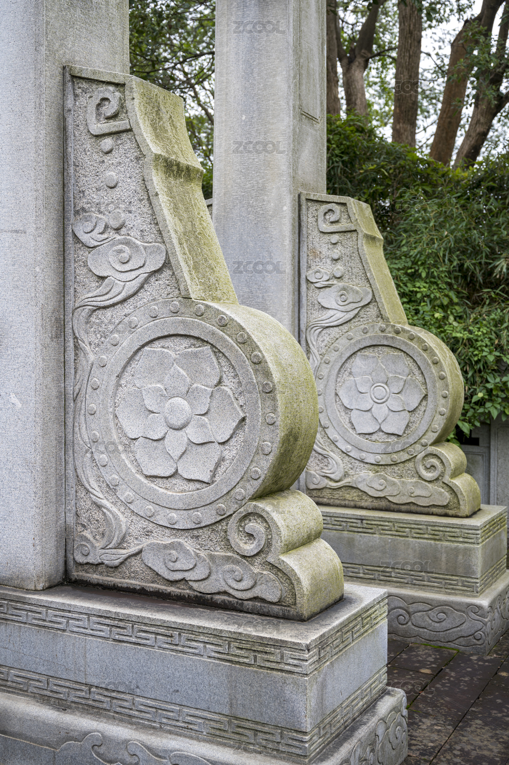 寺庙长廊上祥云图案的石头墩子特写氧化掉色