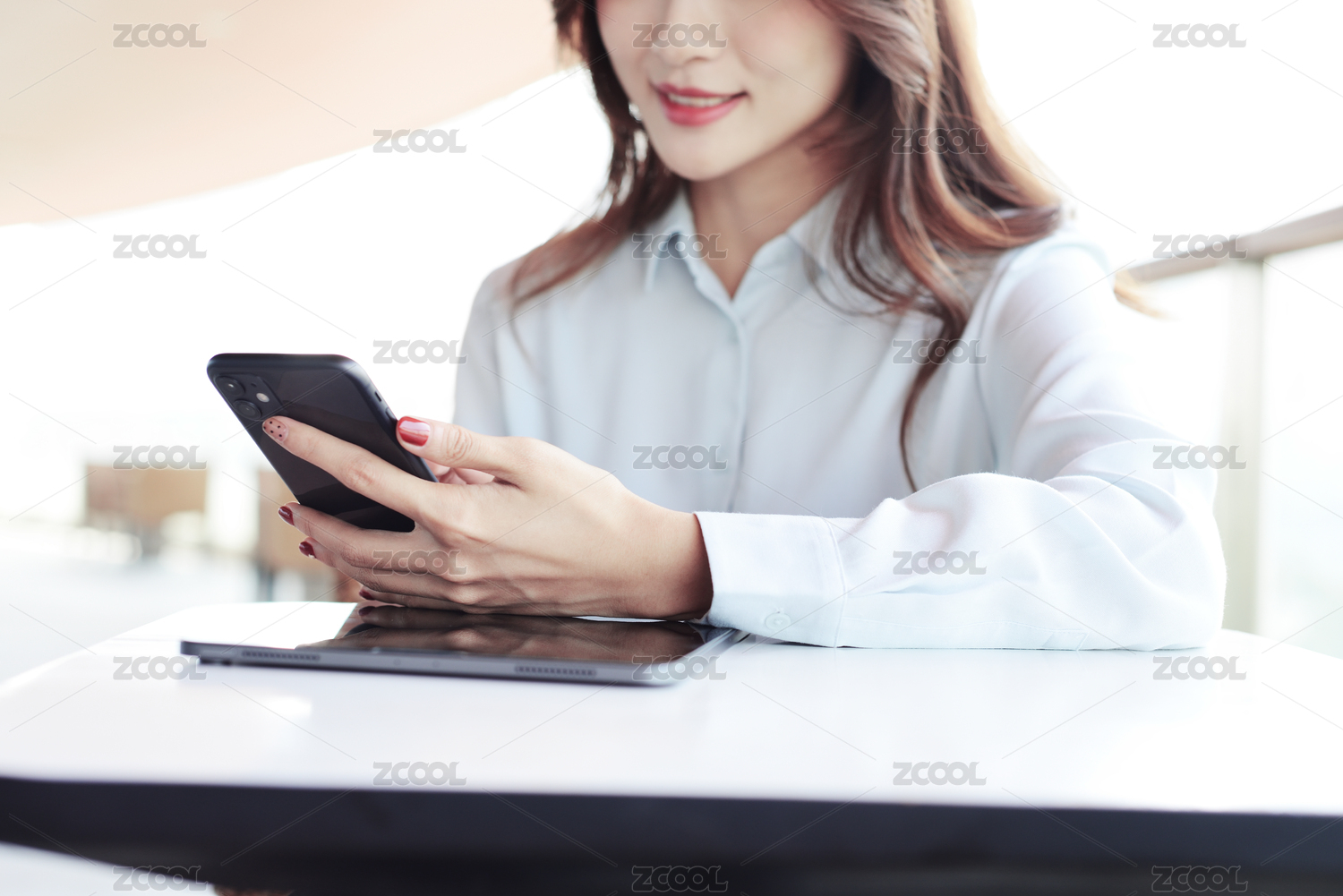 女,商务,办公,咖啡厅,工作,室外,桌子,坐着,手,使用