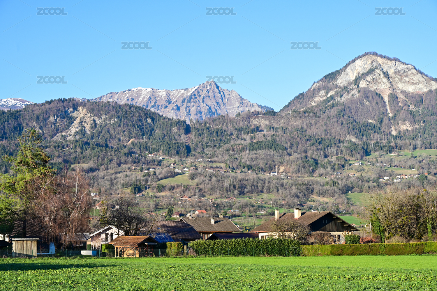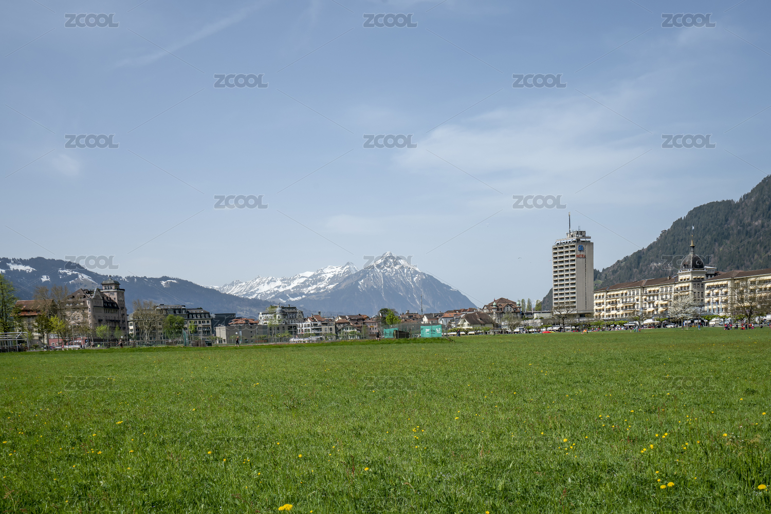 瑞士度假胜地因特拉肯风光美景-雪山草地、蓝天白云
