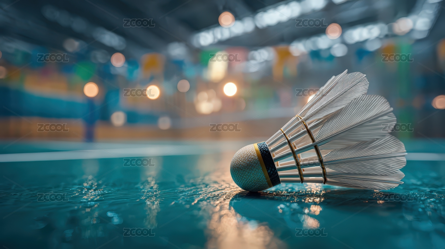 放在明亮整洁的室内羽毛球场地上的羽毛球拍