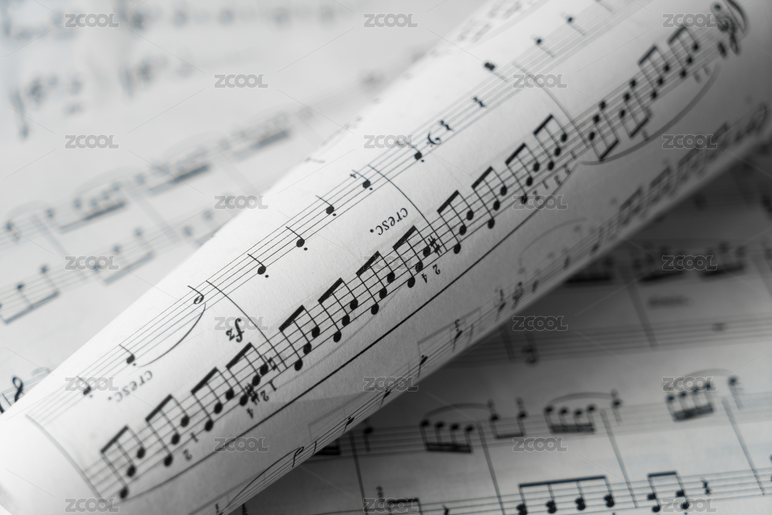 印有乐谱五线谱的纸张散落在桌面上